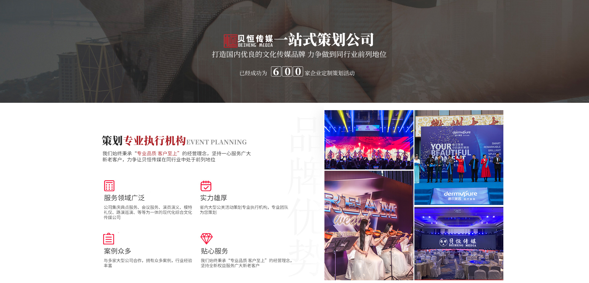 - 合 肥 貝 恒 文 化 傳 媒 專注·專業(yè)·專心·效率 合肥貝恒文化傳媒有限公司2017年成立于安徽·合肥,是省內(nèi)大型公關(guān)活動策劃專業(yè)執(zhí)行機(jī)構(gòu),公司集慶典服務(wù)、會議服務(wù)、演員演藝、模特禮儀、路演巡演、展會特裝、廣告制作、設(shè)備租賃、舞美策劃、企業(yè)形象宣傳等為一體的現(xiàn)代化綜合文化傳媒公司,我們始終秉承“專業(yè)品質(zhì)客戶至上”的經(jīng)營理念,堅(jiān)持全...